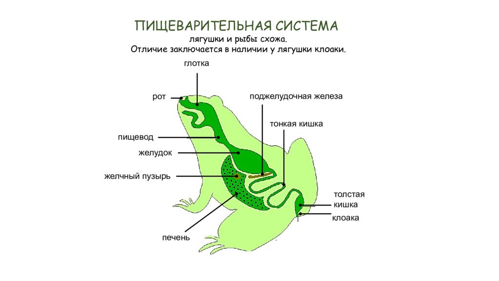 глотка поджелудочная железа тонкая кишка толстая кишка клоака рот пищевод желудок желчный пузырь печень ПИЩЕВАРИТЕЛЬНАЯ СИСТЕМА лягушки и рыбы схожа. О тличие заключается в наличии у лягушки клоаки.