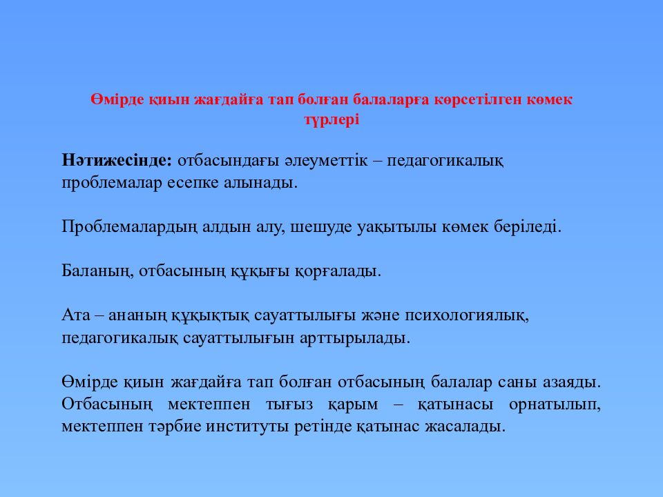 Өмірде қиын жағдайға тап болған балаларға көрсетілген көмек түрлері Нәтижесінде: отбасындағы әлеуметтік – педагогикалық проблемалар есепке алынады. Проблемалардың алдын алу, шешуде уақытылы көмек беріледі. Баланың, отбасының құқығы қорғалады. Ата – ананың құқықтық сауаттылығы және психологиялық, педагогикалық сауаттылығын арттырылады. Өмірде қиын жағдайға тап болған отбасының балалар саны азаяды. Отбасының мектеппен тығыз қарым – қатынасы орнатылып, мектеппен тәрбие институты ретінде қатынас жасалады.
