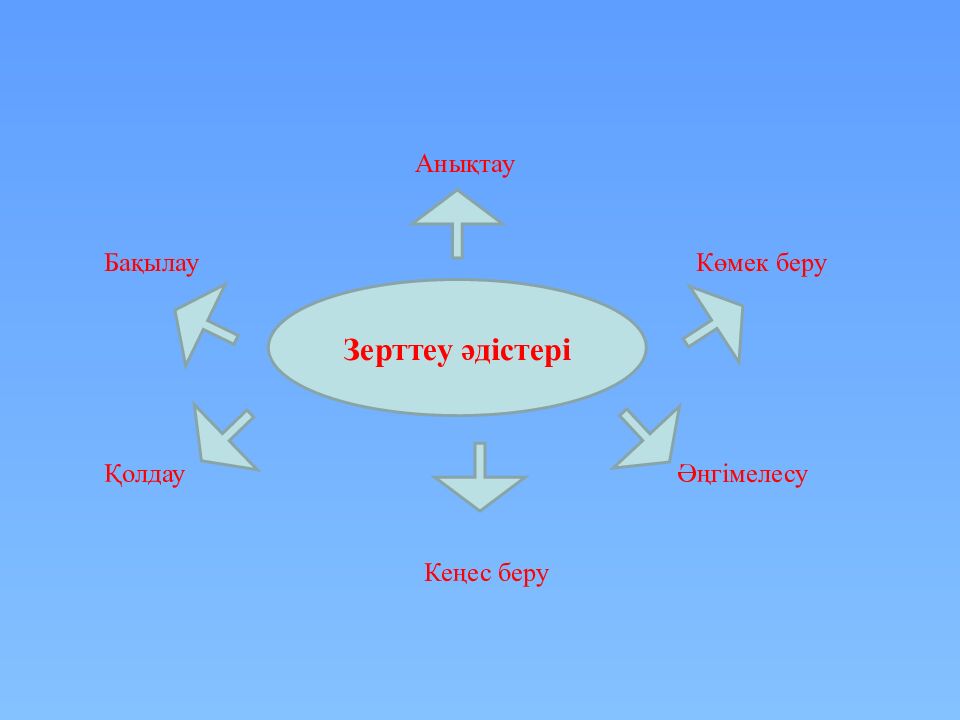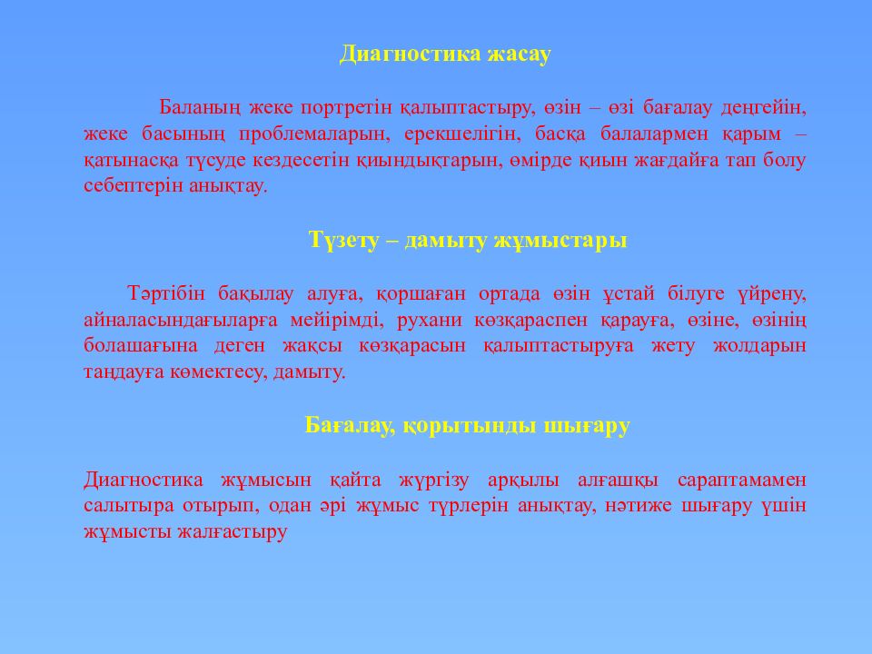 Диагностика жасау Баланың жеке портретін қалыптастыру, өзін – өзі бағалау деңгейін, жеке басының проблемаларын, ерекшелігін, басқа балалармен қарым – қатынасқа түсуде кездесетін қиындықтарын, өмірде қиын жағдайға тап болу себептерін анықтау. Түзету – дамыту жұмыстары Тәртібін бақылау алуға, қоршаған ортада өзін ұстай білуге үйрену, айналасындағыларға мейірімді, рухани көзқараспен қарауға, өзіне, өзінің болашағына деген жақсы көзқарасын қалыптастыруға жету жолдарын таңдауға көмектесу, дамыту. Бағалау, қорытынды шығару Диагностика жұмысын қайта жүргізу арқылы алғашқы сараптамамен салытыра отырып, одан әрі жұмыс түрлерін анықтау, нәтиже шығару үшін жұмысты жалғастыру