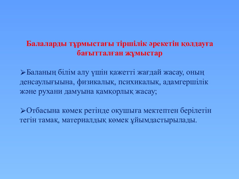 Балаларды тұрмыстағы тіршілік әрекетін қолдауға бағытталған жұмыстар Баланың білім алу үшін қажетті жағдай жасау, оның денсаулығыына, физикалық, психикалық, адамгершілік және рухани дамуына қамқорлық жасау; Отбасына көмек ретінде оқушыға мектептен берілетін тегін тамақ, материалдық көмек ұйымдастырылады.