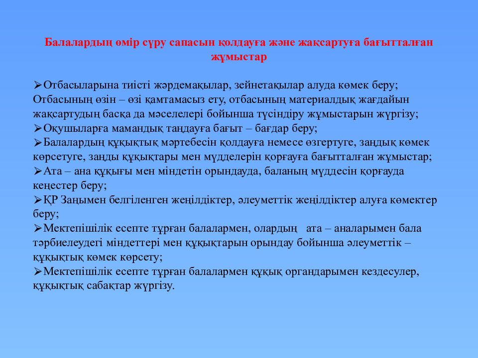 Балалардың өмір сүру сапасын қолдауға және жақсартуға бағытталған жұмыстар Отбасыларына тиісті жәрдемақылар, зейнетақылар алуда көмек беру; Отбасының өзін – өзі қамтамасыз ету, отбасының материалдық жағдайын жақсартудың басқа да мәселелері бойынша түсіндіру жұмыстарын жүргізу; Оқушыларға мамандық таңдауға бағыт – бағдар беру; Балалардың құқықтық мәртебесін қолдауға немесе өзгертуге, заңдық көмек көрсетуге, заңды құқықтары мен мүдделерін қорғауға бағытталған жұмыстар; Ата – ана құқығы мен міндетін орындауда, баланың мүддесін қорғауда кеңестер беру; ҚР Заңымен белгіленген жеңілдіктер, әлеуметтік жеңілдіктер алуға көмектер беру; Мектепішілік есепте тұрған балалармен, олардың ата – аналарымен бала тәрбиелеудегі міндеттері мен құқықтарын орындау бойынша әлеуметтік – құқықтық көмек көрсету; Мектепішілік есепте тұрған балалармен құқық органдарымен кездесулер, құқықтық сабақтар жүргізу.