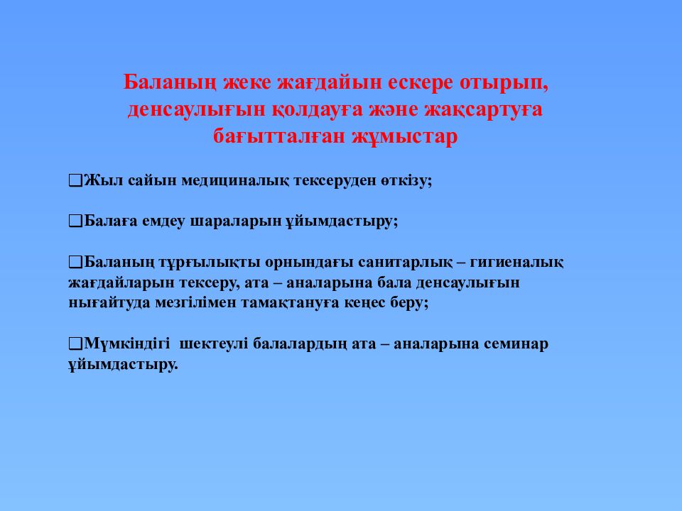 Баланың жеке жағдайын ескере отырып, денсаулығын қолдауға және жақсартуға бағытталған жұмыстар Жыл сайын медициналық тексеруден өткізу; Балаға емдеу шараларын ұйымдастыру; Баланың тұрғылықты орнындағы санитарлық – гигиеналық жағдайларын тексеру, ата – аналарына бала денсаулығын нығайтуда мезгілімен тамақтануға кеңес беру; Мүмкіндігі шектеулі балалардың ата – аналарына семинар ұйымдастыру.