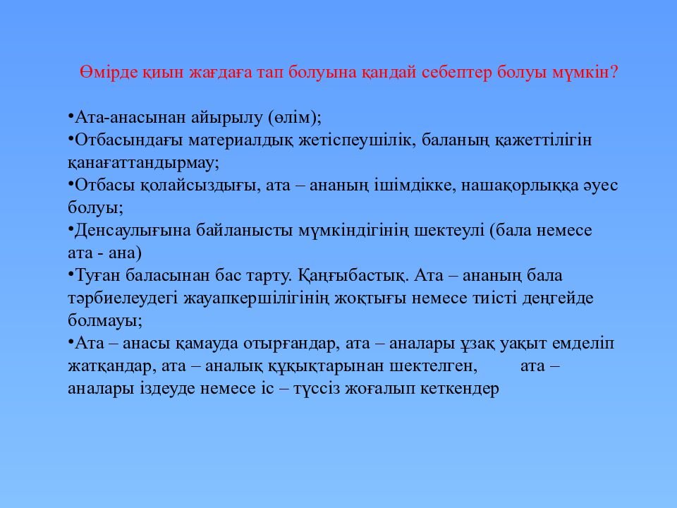 Өмірде қиын жағдаға тап болуына қандай себептер болуы мүмкін? Ата-анасынан айырылу (өлім); Отбасындағы материалдық жетіспеушілік, баланың қажеттілігін қанағаттандырмау; Отбасы қолайсыздығы, ата – ананың ішімдікке, нашақорлыққа әуес болуы; Денсаулығына байланысты мүмкіндігінің шектеулі (бала немесе ата - ана) Туған баласынан бас тарту. Қаңғыбастық. Ата – ананың бала тәрбиелеудегі жауапкершілігінің жоқтығы немесе тиісті деңгейде болмауы; Ата – анасы қамауда отырғандар, ата – аналары ұзақ уақыт емделіп жатқандар, ата – аналық құқықтарынан шектелген, ата – аналары іздеуде немесе іс – түссіз жоғалып кеткендер