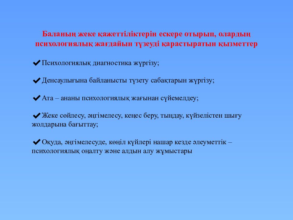 Баланың жеке қажеттіліктерін ескере отырып, олардың психологиялық жағдайын түзеуді қарастыратын қызметтер Психологиялық диагностика жүргізу; Денсаулығына байланысты түзету сабақтарын жүргізу; Ата – ананы психологиялық жағынан сүйемелдеу; Жеке сөйлесу, әңгімелесу, кеңес беру, тыңдау, күйзелістен шығу жолдарына бағыттау; Оқуда, әңгімелесуде, көңіл күйлері нашар кезде әлеуметтік – психологиялық оңалту және алдын алу жұмыстары