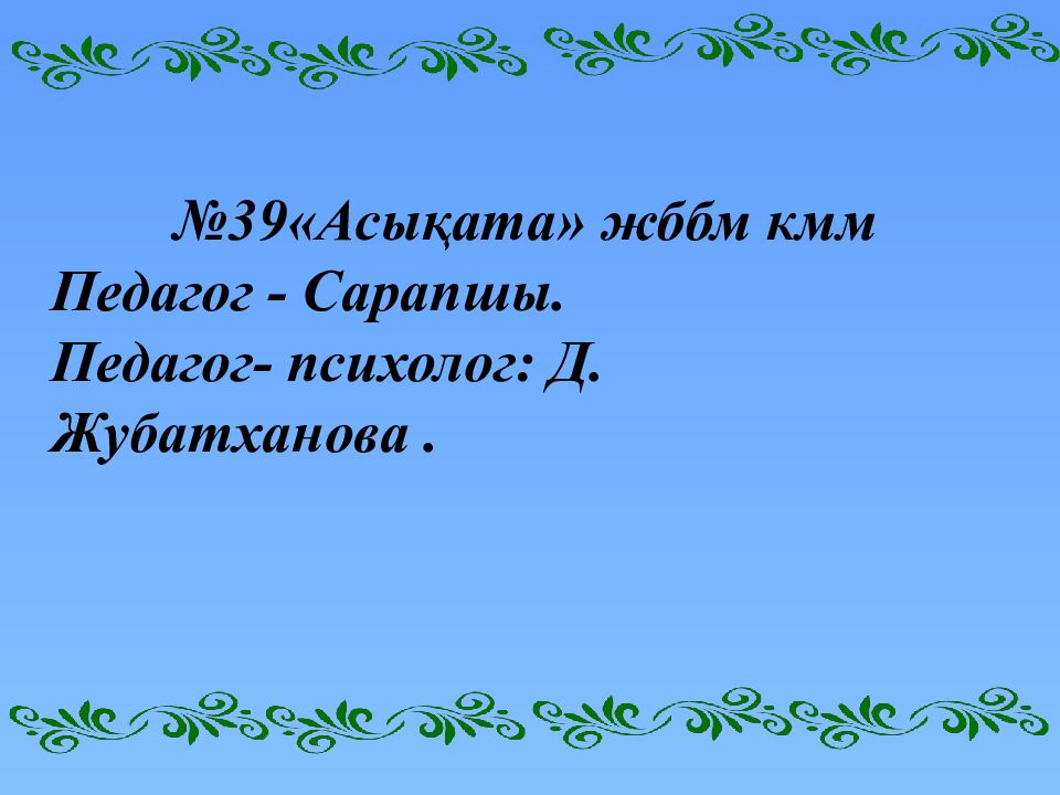 Последний слайд презентации: 39 « Асықата » жббм кмм Педагог - Сарапшы. Педагог - психолог : Д. Жубатханова