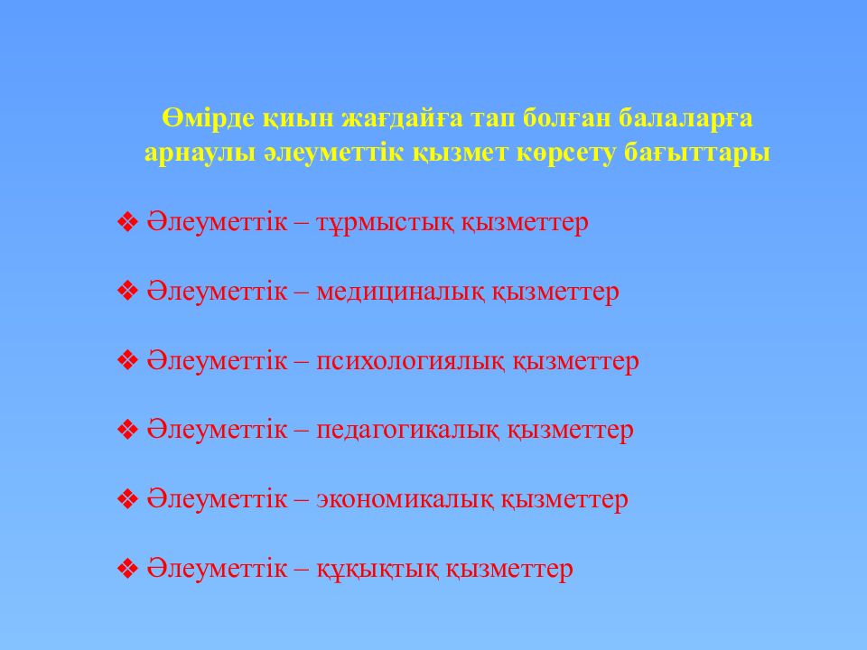 Өмірде қиын жағдайға тап болған балаларға арнаулы әлеуметтік қызмет көрсету бағыттары Әлеуметтік – тұрмыстық қызметтер Әлеуметтік – медициналық қызметтер Әлеуметтік – психологиялық қызметтер Әлеуметтік – педагогикалық қызметтер Әлеуметтік – экономикалық қызметтер Әлеуметтік – құқықтық қызметтер