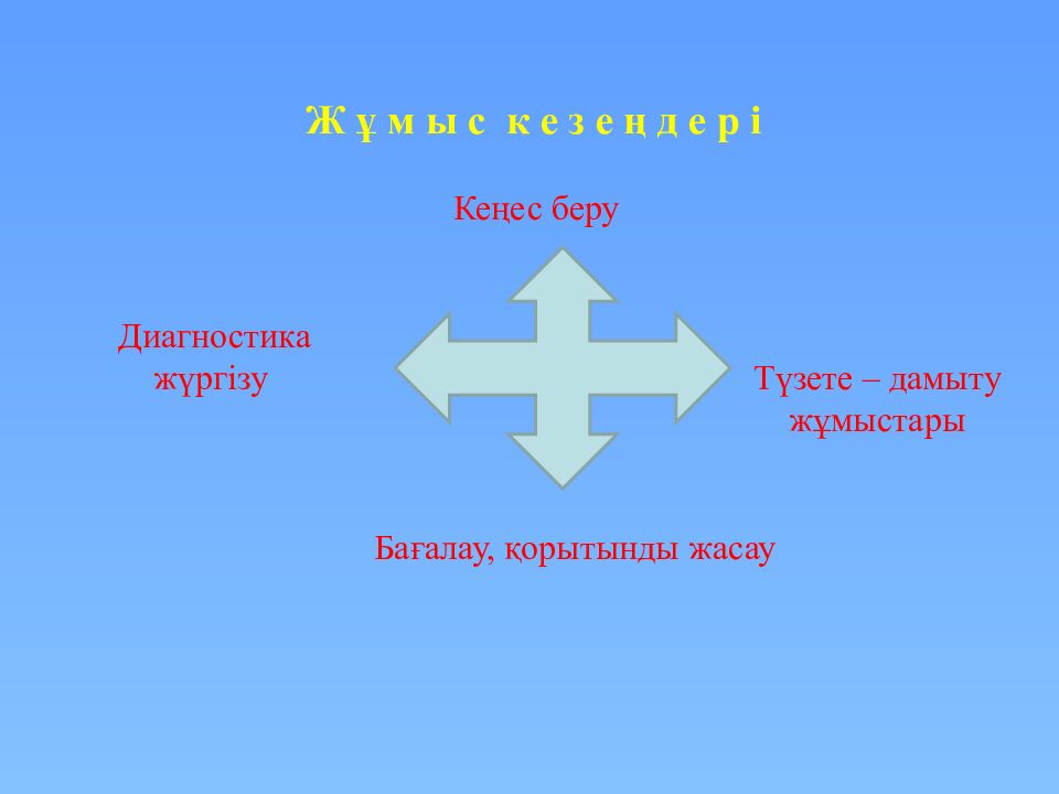 Ж ұ м ы с к е з е ң д е р і Кеңес беру Диагностика жүргізу Түзете – дамыту жұмыстары Бағалау, қорытынды жасау