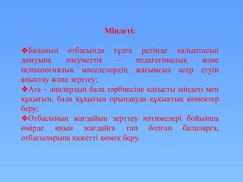 Міндеті: Баланың отбасында тұлға ретінде қалыптасып дамуына әлеуметтік – педагогикалық және психологиялық мәселелердің жағымсыз әсер етуін анықтау және зерттеу; Ата – аналардың бала тәрбиесіне қатысты міндеті мен құқығын, бала құқығын орындауда құқықтық көмектер беру; Отбасының жағдайын зерттеу нәтижелері бойынша өмірде қиын жағдайға тап болған балаларға, отбасыларына қажетті көмек беру.