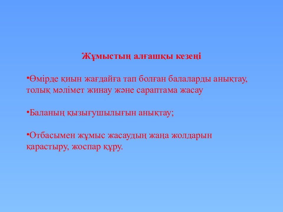 Жұмыстың алғашқы кезеңі Өмірде қиын жағдайға тап болған балаларды анықтау, толық мәлімет жинау және сараптама жасау Баланың қызығушылығын анықтау; Отбасымен жұмыс жасаудың жаңа жолдарын қарастыру, жоспар құру.