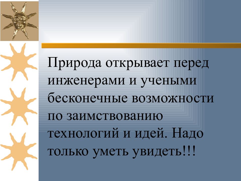 Природа открывает перед инженерами и учеными бесконечные возможности по заимствованию технологий и идей. Надо только уметь увидеть!!!