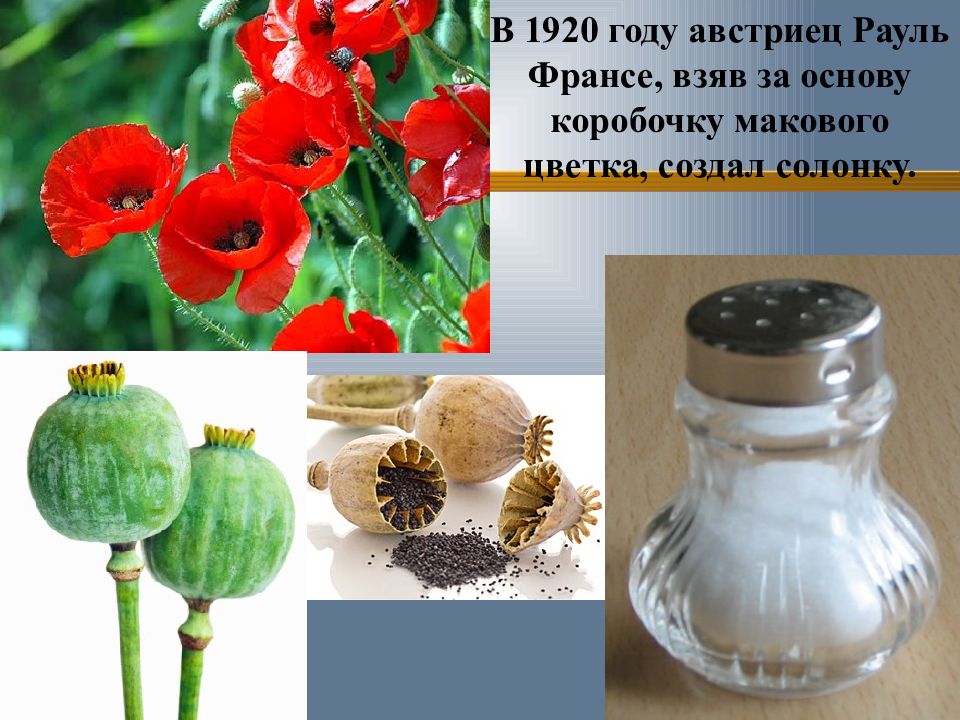 В 1920 году австриец Рауль Франсе, взяв за основу коробочку макового цветка, создал солонку.