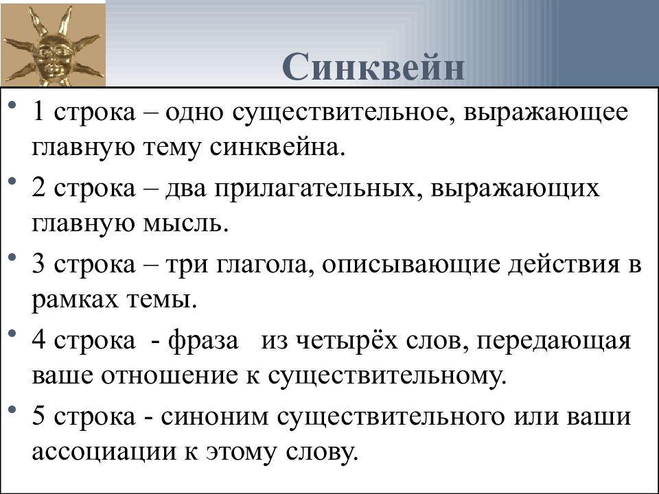 1 строка – одно существительное, выражающее главную тему cинквейна. 2 строка – два прилагательных, выражающих главную мысль. 3 строка – три глагола, описывающие действия в рамках темы. 4 строка - фраза из четырёх слов, передающая ваше отношение к существительному. 5 строка - синоним существительного или ваши ассоциации к этому слову.
