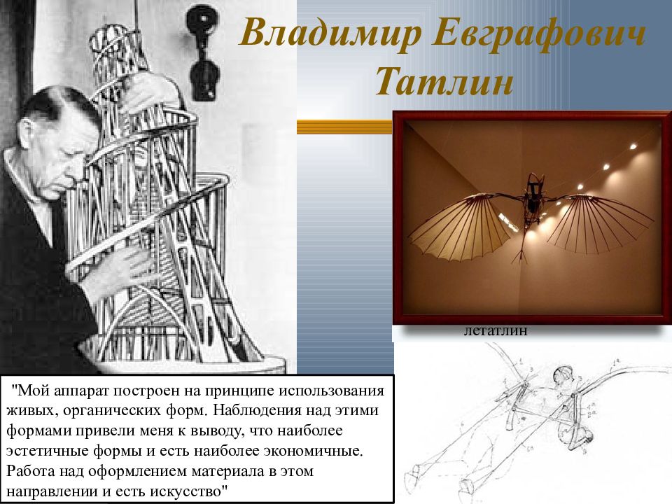 летатлин "Мой аппарат построен на принципе использования живых, органических форм. Наблюдения над этими формами привели меня к выводу, что наиболее эстетичные формы и есть наиболее экономичные. Работа над оформлением материала в этом направлении и есть искусство"