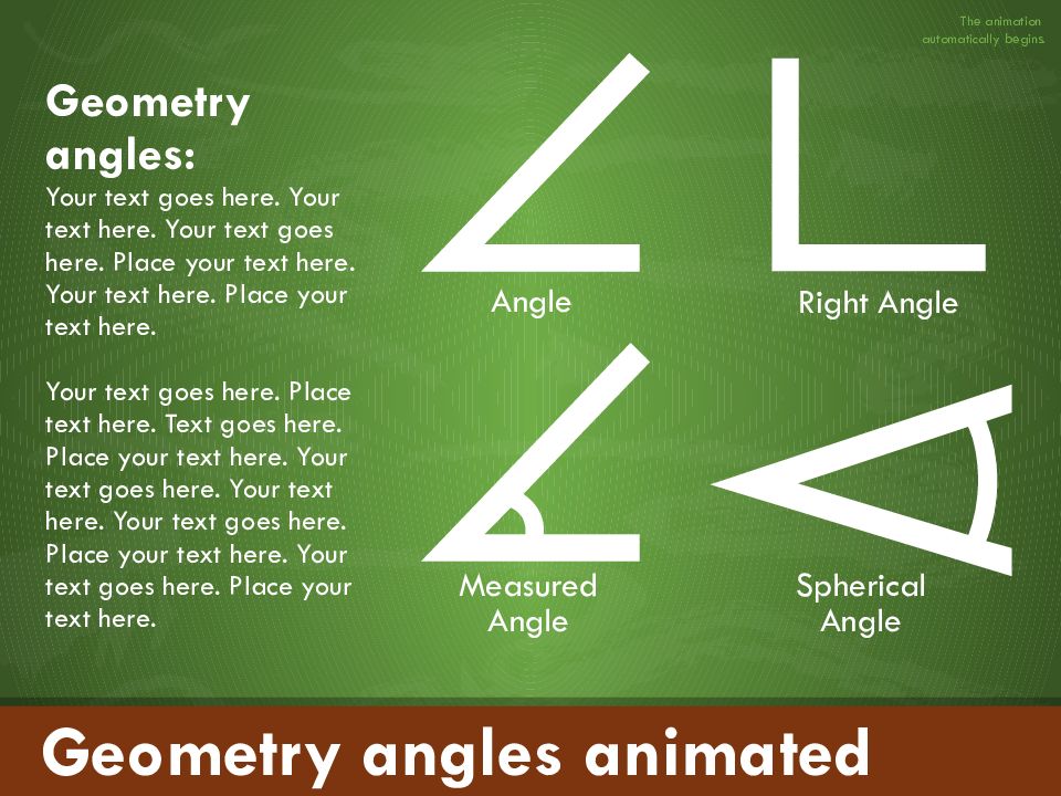 Geometry angles animated Geometry angles: Your text goes here. Your text here. Your text goes here. Place your text here. Your text here. Place your text here. Your text goes here. Place text here. Text goes here. Place your text here. Your text goes here. Your text here. Your text goes here. Place your text here. Your text goes here. Place your text here. Spherical Angle Measured Angle Right Angle Angle The animation automatically begins.