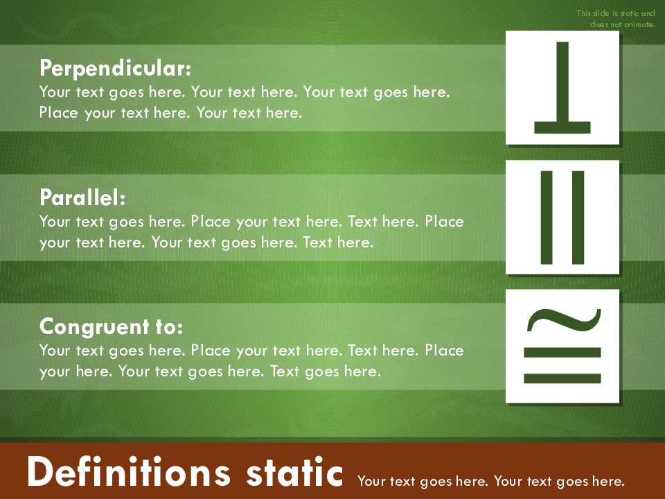 Definitions static Your text goes here. Your text goes here. Congruent to: Your text goes here. Place your text here. Text here. Place your here. Your text goes here. Text goes here. Parallel: Your text goes here. Place your text here. Text here. Place your text here. Your text goes here. Text here. Perpendicular: Your text goes here. Your text here. Your text goes here. Place your text here. Your text here. This slide is static and does not animate.