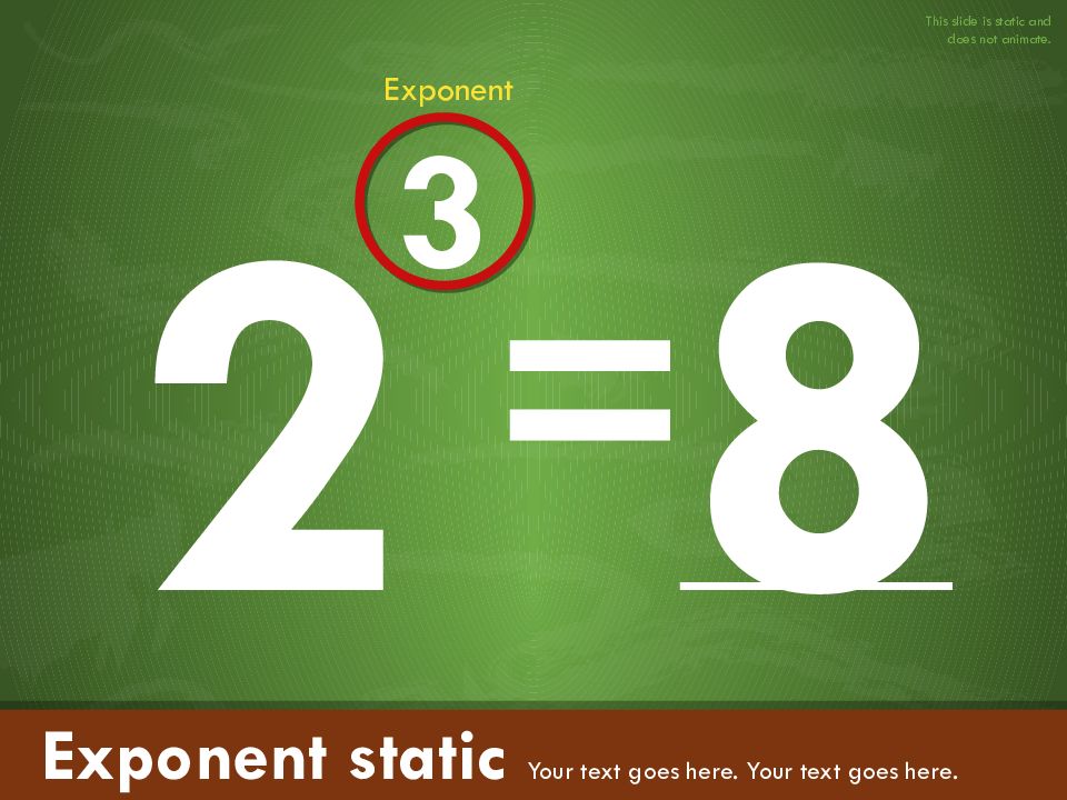 Exponent static Your text goes here. Your text goes here. 2 3 8 Exponent This slide is static and does not animate.