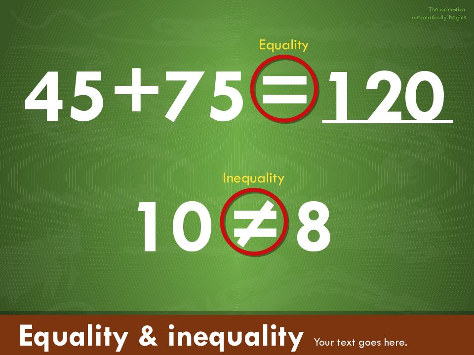 Equality & inequality Your text goes here. 8 Inequality 1 0 1 20 7 5 4 5 Equality The animation automatically begins.
