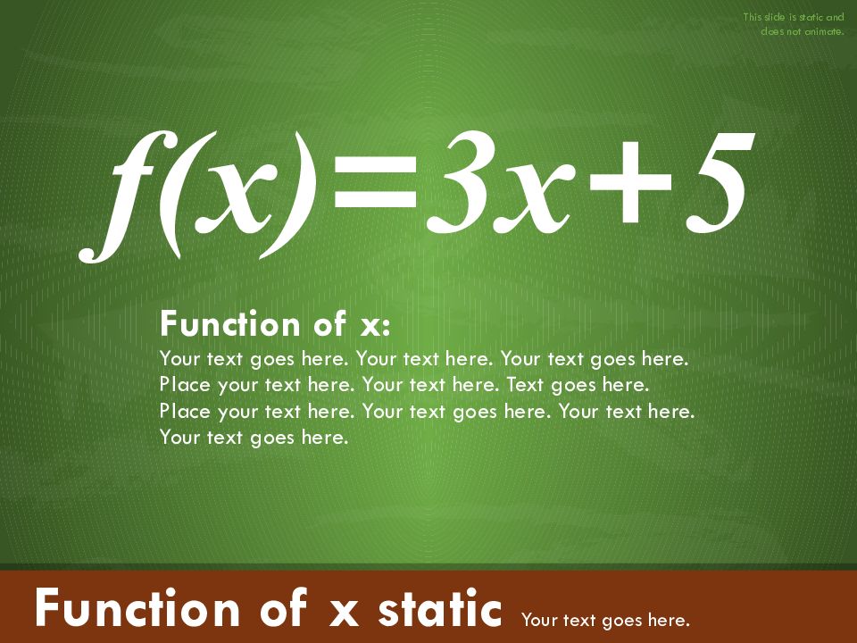 Function of x static Your text goes here. f(x) = 3 x + 5 Function of x: Your text goes here. Your text here. Your text goes here. Place your text here. Your text here. Text goes here. Place your text here. Your text goes here. Your text here. Your text goes here. This slide is static and does not animate.