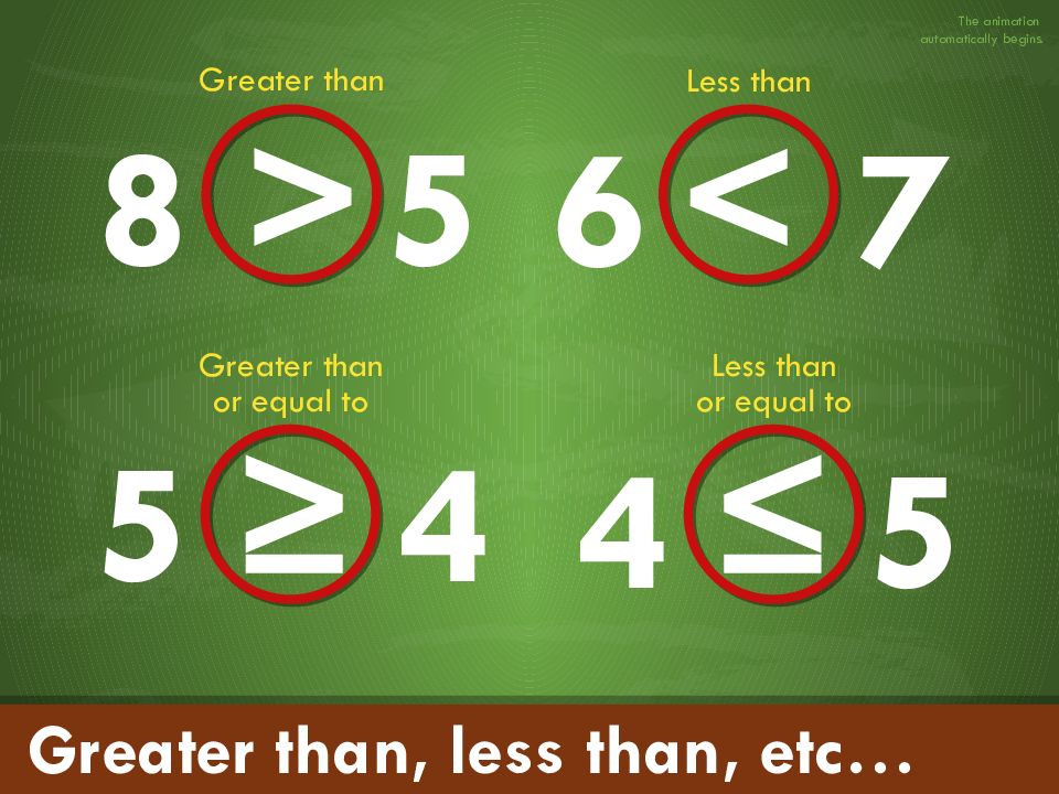 Greater than, less than, etc… 8 5 6 7 5 4 4 5 Less than Greater than Less than o r equal to Greater than o r equal to The animation automatically begins.