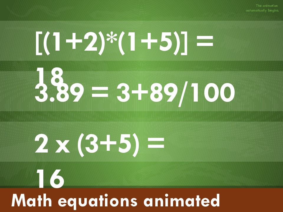 Math equations animated 2 x (3+5) = 1 6 3.89 = 3+89/ 1 0 0 [(1+2)*(1+5)] = 1 8 The animation automatically begins.