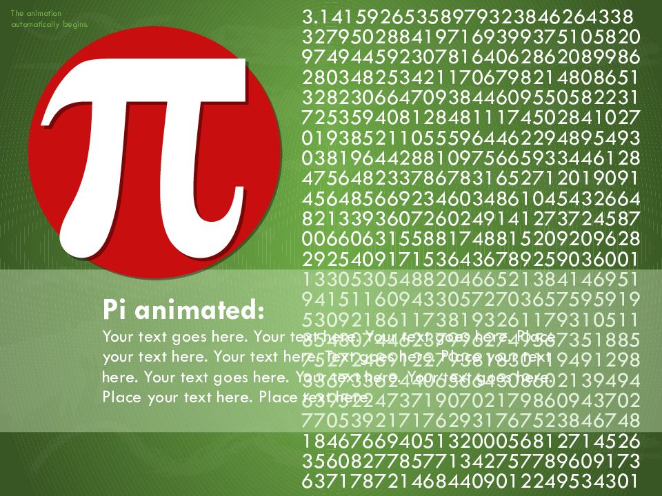 3.1415926535897932384626433832795028841971693993751058209749445923078164062862089986280348253421170679821480865132823066470938446095505822317253594081284811174502841027019385211055596446229489549303819644288109756659334461284756482337867831652712019091456485669234603486104543266482133936072602491412737245870066063155881748815209209628292540917153643678925903600113305305488204665213841469519415116094330572703657595919530921861173819326117931051185480744623799627495673518857527248912279381830119491298336733624406566430860213949463952247371907021798609437027705392171762931767523846748184676694051320005681271452635608277857713427577896091736371787214684409012249534301 Pi animated: Your text goes here. Your text here. Your text goes here. Place your text here. Your text here. Text goes here. Place your text here. Your text goes here. Your text here. Your text goes here. Place your text here. Place text here. The animation automatically begins.