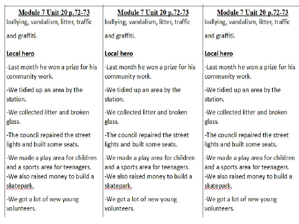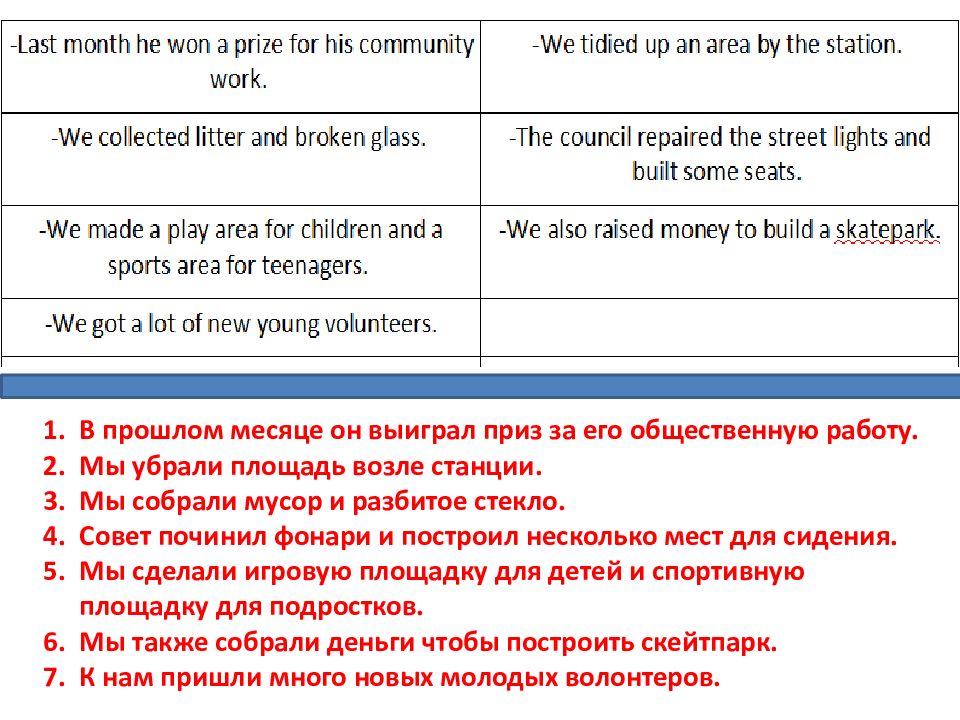 В прошлом месяце он выиграл приз за его общественную работу. Мы убрали площадь возле станции. Мы собрали мусор и разбитое стекло. Совет починил фонари и построил несколько мест для сидения. Мы сделали игровую площадку для детей и спортивную площадку для подростков. Мы также собрали деньги чтобы построить скейтпарк. К нам пришли много новых молодых волонтеров.