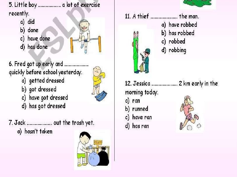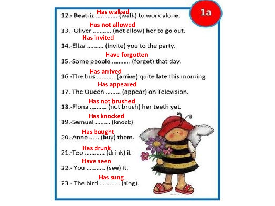 Has walked Has not allowed Has invited Have forgotten Has arrived Has appeared Has not brushed Has knocked Has bought Has drunk Have seen Has sung
