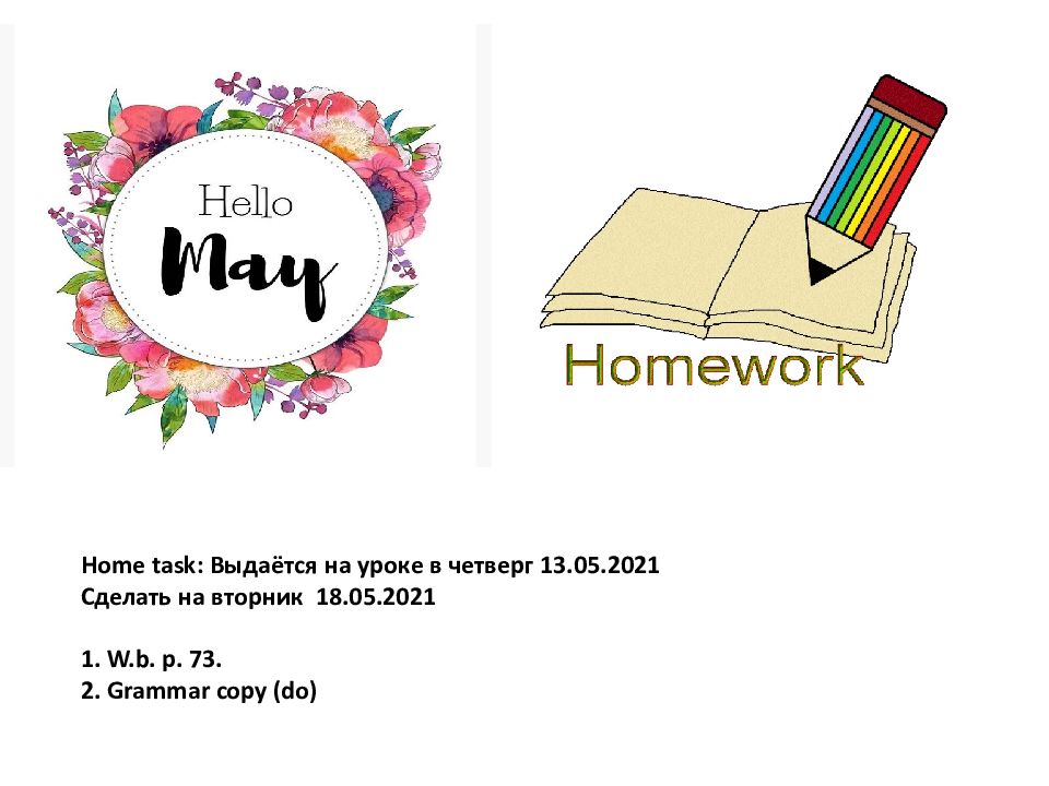 Home task: Выдаётся на уроке в четверг 13.05.2021 Сделать на вторник 1 8.05.2021 1. W.b. p. 7 3. 2. Grammar copy (do)
