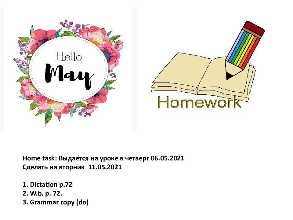 Home task: Выдаётся на уроке в четверг 06.05.2021 Сделать на вторник 11.05.2021 1. Dictation p.7 2 2. W.b. p. 72. 3. Grammar copy (do)