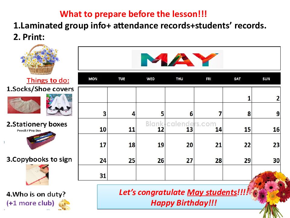 What to prepare before the lesson!!! 1.Laminated group info+ attendance records+students ’ records. 2. Print : Let’s congratulate May students !!!! Happy Birthday!! !