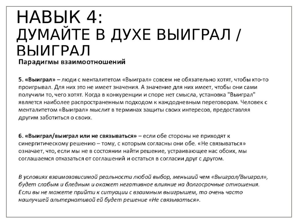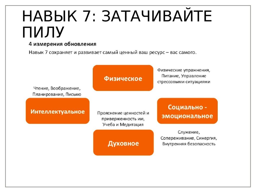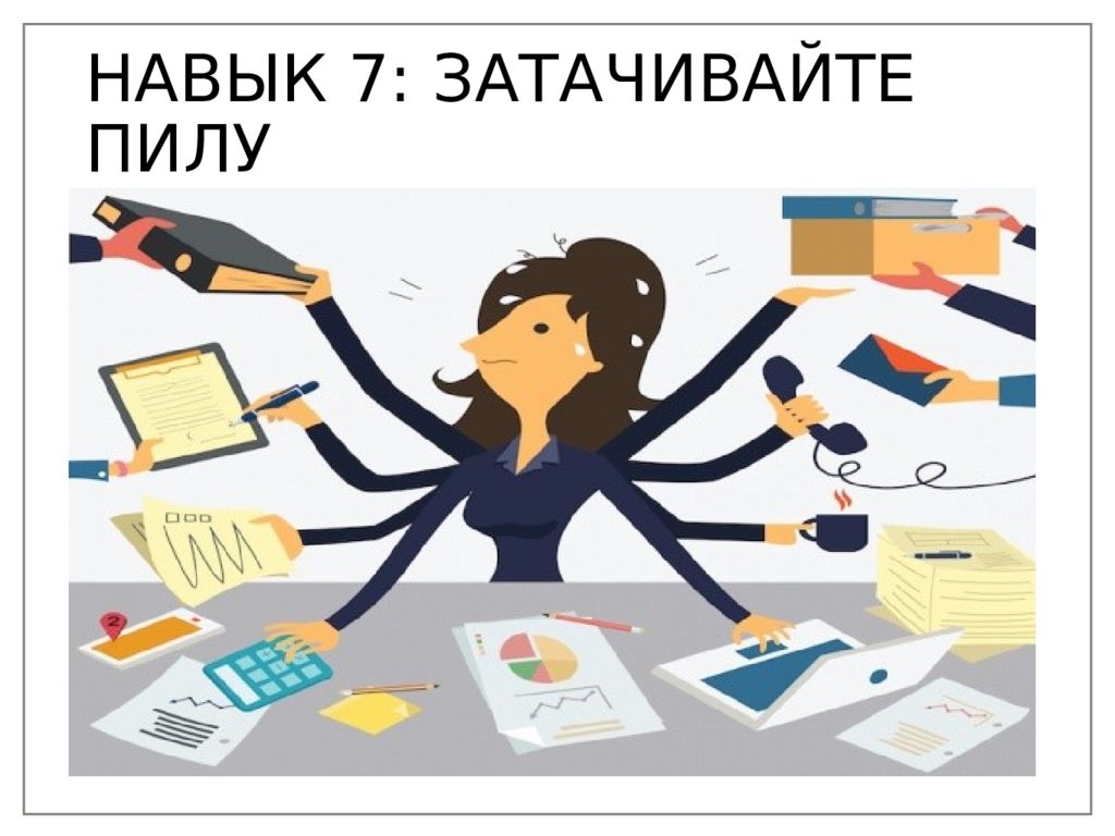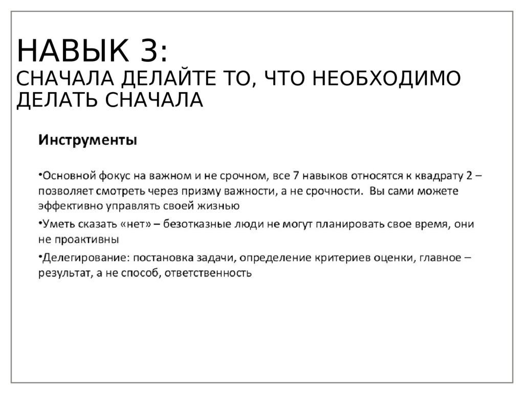 1 Будьте проактивны. 2 Начиная, представляйте конечную цель. 3 Сначала делайте то, что нужно делать сначала. 4 Думайте в духе «выиграл-выиграл». 5 Сначала старайтесь услышать, а потом быть услышанным. 6 Достигайте синергии (стремитесь к творческому взаимовыгодному взаимодействию). 7 Затачивайте пилу (постоянно совершенствуйтесь ).