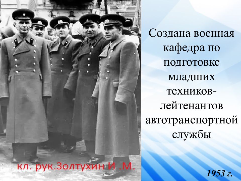 Слайд 19: Создана военная кафедра по подготовке младших техников-лейтенантов автотранспортной службы