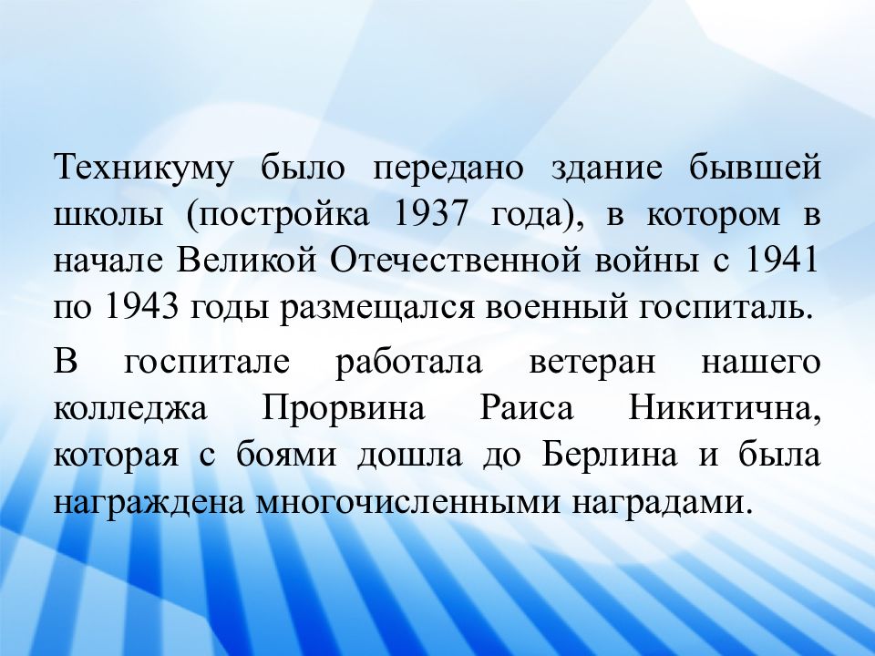 Техникуму было передано здание бывшей школы (постройка 1937 года), в котором в начале Великой Отечественной войны с 1941 по 1943 годы размещался военный госпиталь. В госпитале работала ветеран нашего колледжа Прорвина Раиса Никитична, которая с боями дошла до Берлина и была награждена многочисленными наградами.