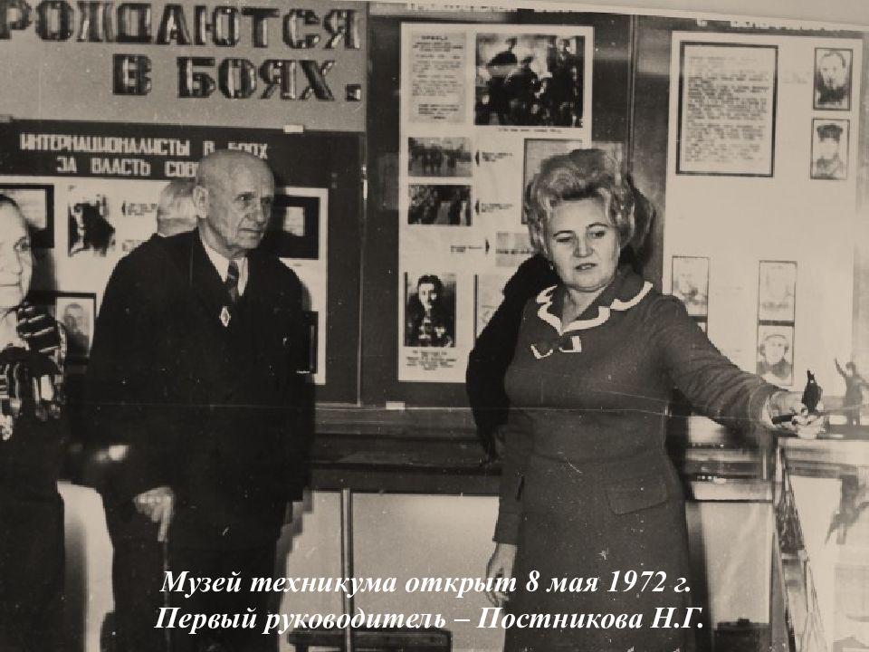 Слайд 34: Музей техникума открыт 8 мая 1972 г. Первый руководитель – Постникова Н.Г