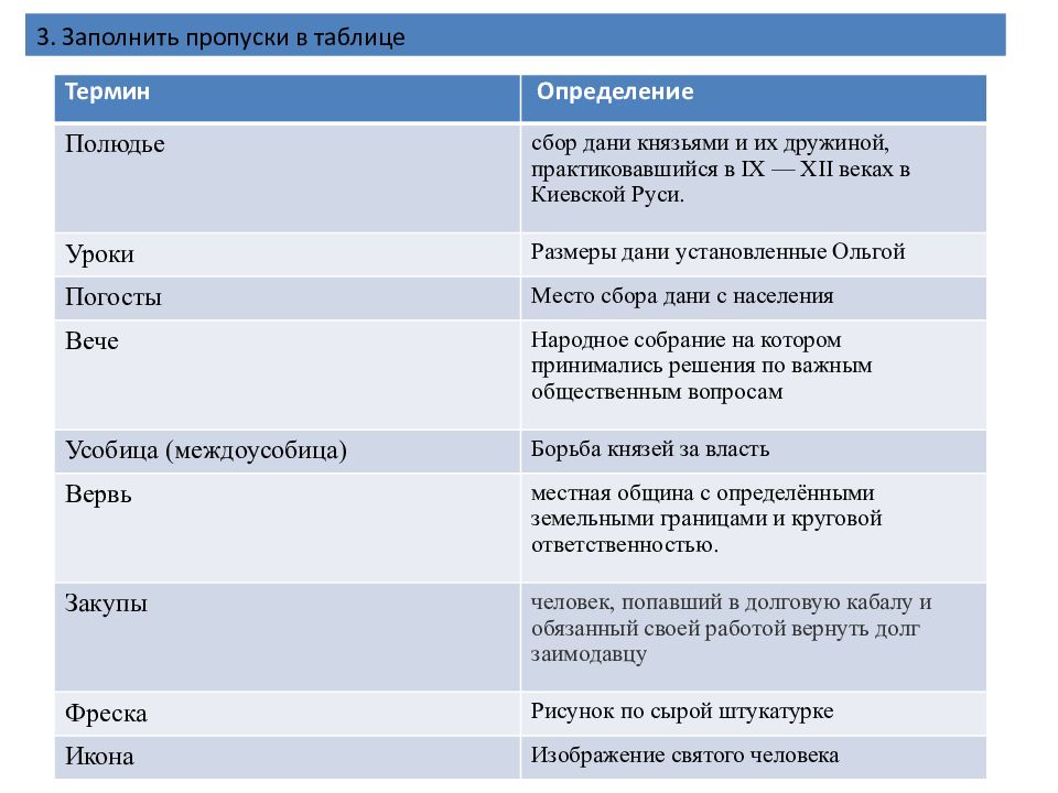 3. Заполнить пропуски в таблице Термин Определение Полюдье сбор дани князьями и их дружиной, практиковавшийся в IX — XII веках в Киевской Руси. Уроки Размер ы дани установленные Ольгой Погосты Место сбора дани с населения Вече Народное собрание на котором принимались решения по важным общественным вопросам Усобица (междоусобица) Борьба князей за власть Вервь местная община с определёнными земельными границами и круговой ответственностью. Закупы человек, попавший в долговую кабалу и обязанный своей работой вернуть долг заимодавцу Фреска Рисунок по сырой штукатурке Икона Изображение святого человека