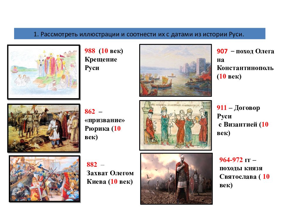 988 ( 10 век) Крещение Руси 964-972 гг – походы князя Святослава ( 10 век ) 907 – поход Олега на Константинополь ( 10 век) 882 – Захват Олегом Киева ( 10 век) 1. Рассмотреть иллюстрации и соотнести их с датами из истории Руси. 862 – «призвание» Рюрика ( 10 век ) 911 – Договор Руси с Византией ( 10 век)