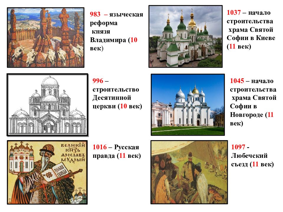 1016 – Русская правда ( 11 век ) 996 – строительство Десятинной церкви ( 10 век) 1037 – начало с троительства храма Святой Софии в Киеве ( 11 век) 1045 – начало строительства храма Святой Софии в Новгороде ( 11 век) 1097 - Любечский съезд ( 11 век ) 983 – языческая реформа князя Владимира ( 10 век )