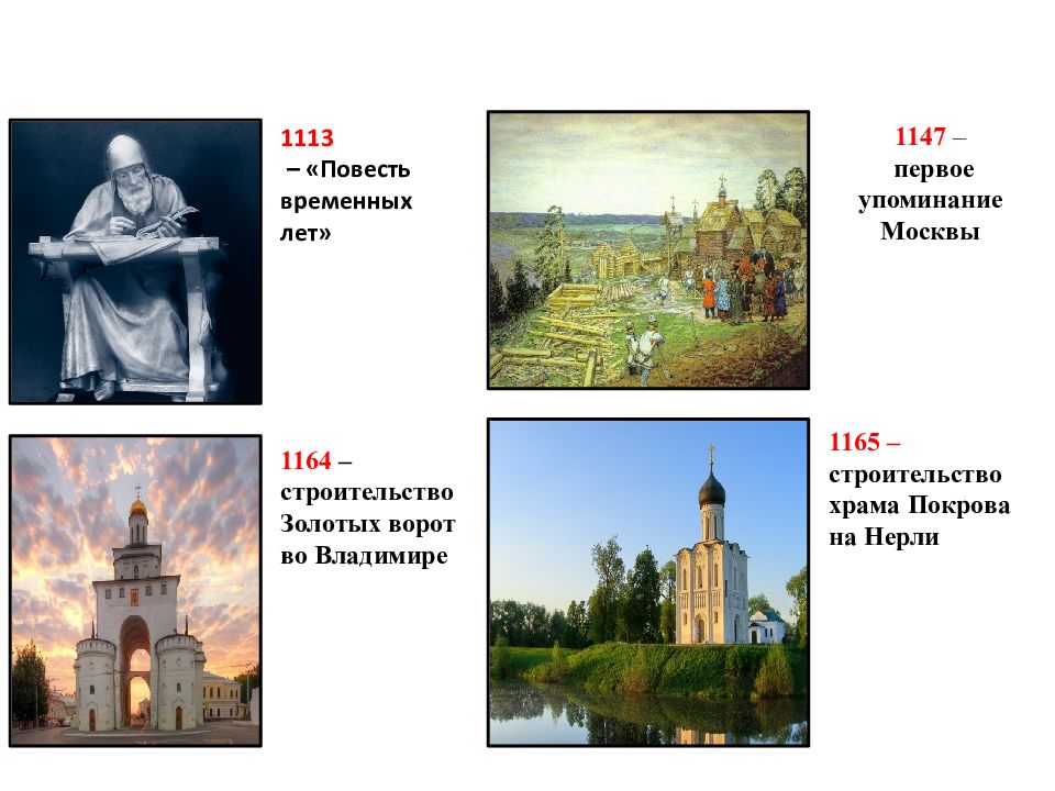 1165 – строительство храма Покрова на Нерли 1113 – «Повесть временных лет » 1164 – строительство Золотых ворот во Владимире 1147 – первое упоминание Москвы