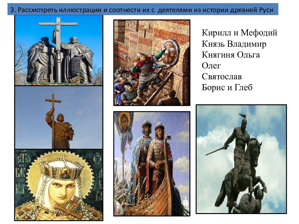 Кирилл и Мефодий Князь Владимир Княгиня Ольга Олег Святослав Борис и Глеб 3. Рассмотреть иллюстрации и соотнести их с деятелями из истории древней Р уси