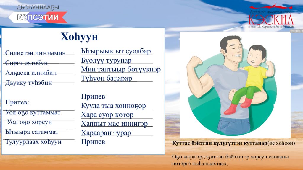 Куттас бэйэтин күлүгүттэн куттанар (өс хоһоон) Оҕо кыра эрдэҕиттэн бэйэтигэр хорсун санааны иитэргэ кыһаныахтаах. Силистэн иҥнэммин Сиргэ охтобун Алҕаска илиибин Дьукку түһэбин Припев: Уол оҕо куттаммат Уол оҕо хорсун Ытыыра сатаммат Тулуурдаах хоһуун Ытырыык ыт суолбар Бүөлүү турунар Мин таптыыр бөтүүкпэр Түһүөн баҕарар Припев Куула тыа хонноҕор Хара суор көтөр Хаппыт мас иннигэр Харааран турар Припев Хо һуун