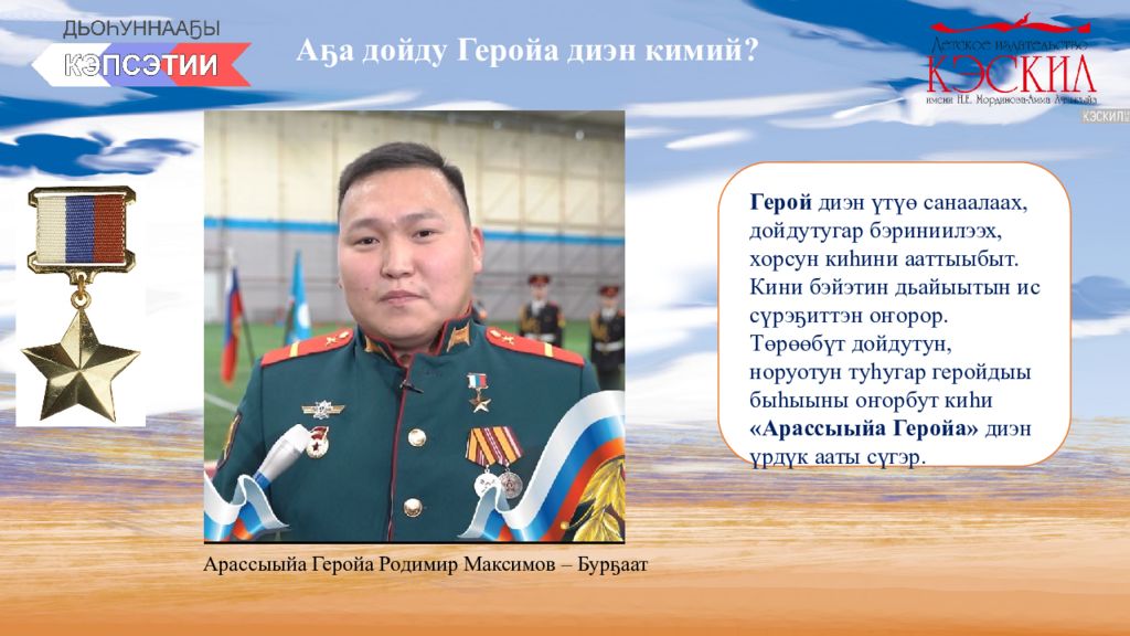 Аҕа дойду Геройа диэн кимий ? Арассыыйа Геройа Родимир Максимов – Бур ҕаат Герой диэн үтүө санаалаах, дойдутугар бэриниилээх, хорсун киһини ааттыыбыт. Кини бэйэтин дьайыытын ис сүрэҕиттэн оҥорор. Төрөөбүт дойдутун, норуотун туһугар геройдыы быһыыны оҥорбут киһи «Арассыыйа Геройа» диэн үрдүк ааты сүгэр.