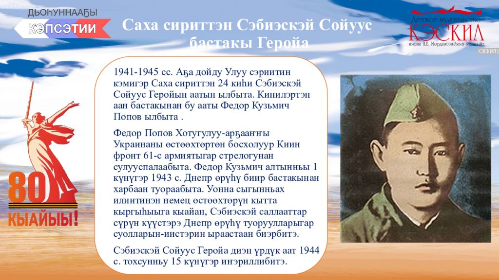 1941-1945 сс. Аҕа дойду Улуу сэриитин кэмигэр Саха сириттэн 24 киһи Сэбиэскэй Сойуус Геройын аатын ылбыта. Кинилэртэн аан бастакынан бу ааты Федор Кузьмич Попов ылбыта. Федор Попов Хотугулуу-арҕааҥҥы Украинаны өстөөхтөртөн босхолуур Киин фронт 61-с армиятыгар стрелогунан сулууспалаабыта. Федор Кузьмич алтынньы 1 күнүгэр 1943 с. Днепр өрүһү биир бастакынан харбаан туораабыта. Уонна сыгынньах илиитинэн немец өстөөхтөрүн кытта кыргыһыыга кыайан, Сэбиэскэй саллааттар сүрүн күүстэрэ Днепр өрүһү туоруулларыгар суолларын-иистэрин ыраастаан биэрбитэ. Сэбиэскэй Сойуус Геройа диэн үрдүк аат 1944 с. тохсунньу 15 күнүгэр иҥэриллибитэ.