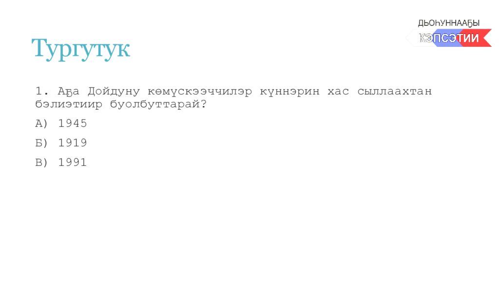 1. Аҕа Дойдуну көмүскээччилэр күннэрин хас сыллаахтан бэлиэтиир буолбуттарай ? А) 1945 Б) 1919 В) 1991