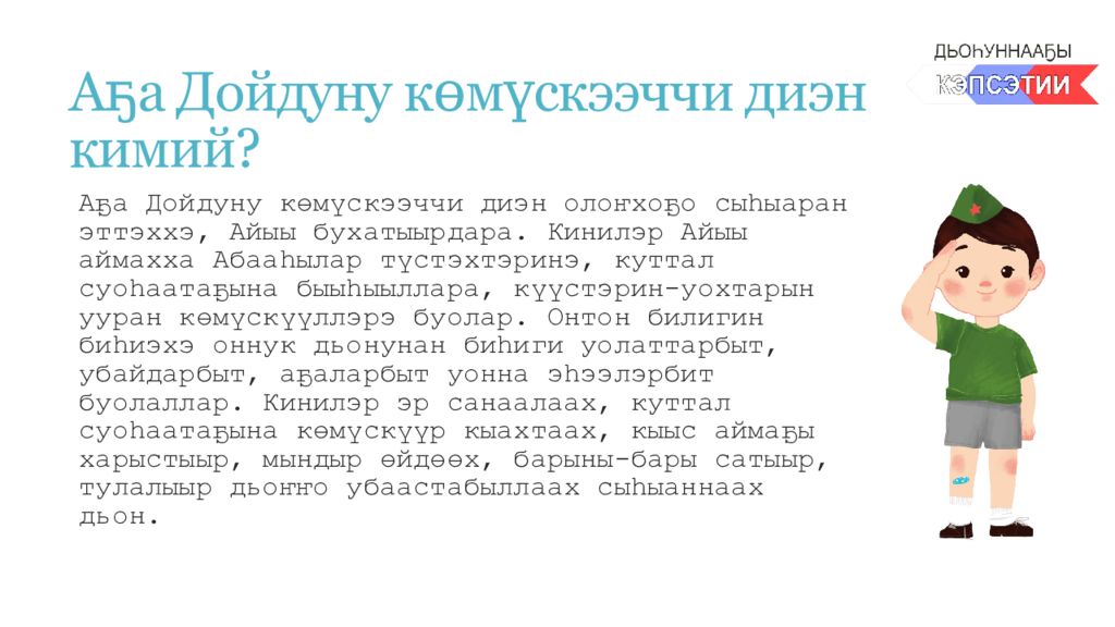 Слайд 3: Аҕа Дойдуну көмүскээччи диэн кимий ?