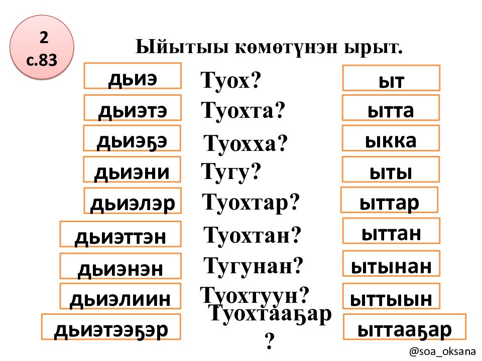 2 с.83 Ыйытыы көмөтүнэн ырыт. Тугу? Туохха? Туохтааҕар? Туохтан? Туохтар? Туох? Туохта? Туохтуун? Тугунан? дьиэ дьиэтэ дьиэҕэ дьиэни дьиэлэр дьиэлиин дьиэттэн дьиэнэн дьиэтээҕэр ыт ытта ыкка ыты ыттар ыттан ытынан ыттыын ыттааҕар