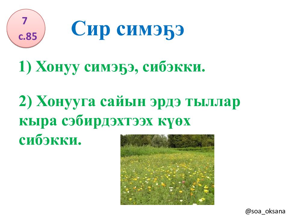 7 с.85 1) Хонуу симэҕэ, сибэкки. 2) Хонууга сайын эрдэ тыллар кыра сэбирдэхтээх күөх сибэкки.