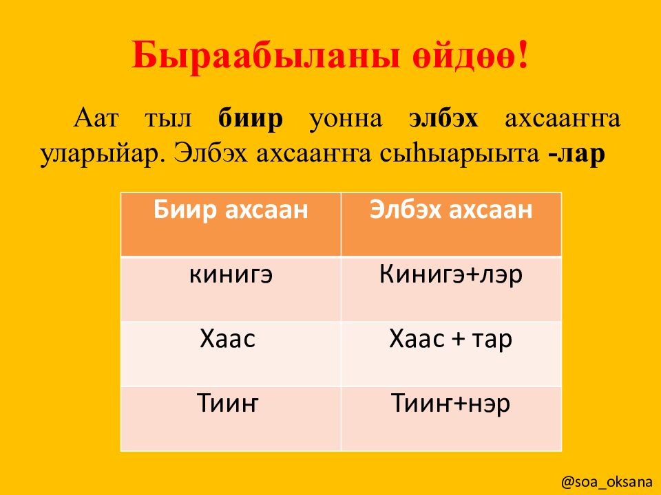 Аат тыл биир уонна элбэх ахсааҥҥа уларыйар. Элбэх ахсааҥҥа сыһыарыыта -лар Быраабыланы өйдөө! Биир ахсаан Элбэх ахсаан кинигэ Кинигэ+лэр Хаас Хаас + тар Тииҥ Тииҥ+нэр