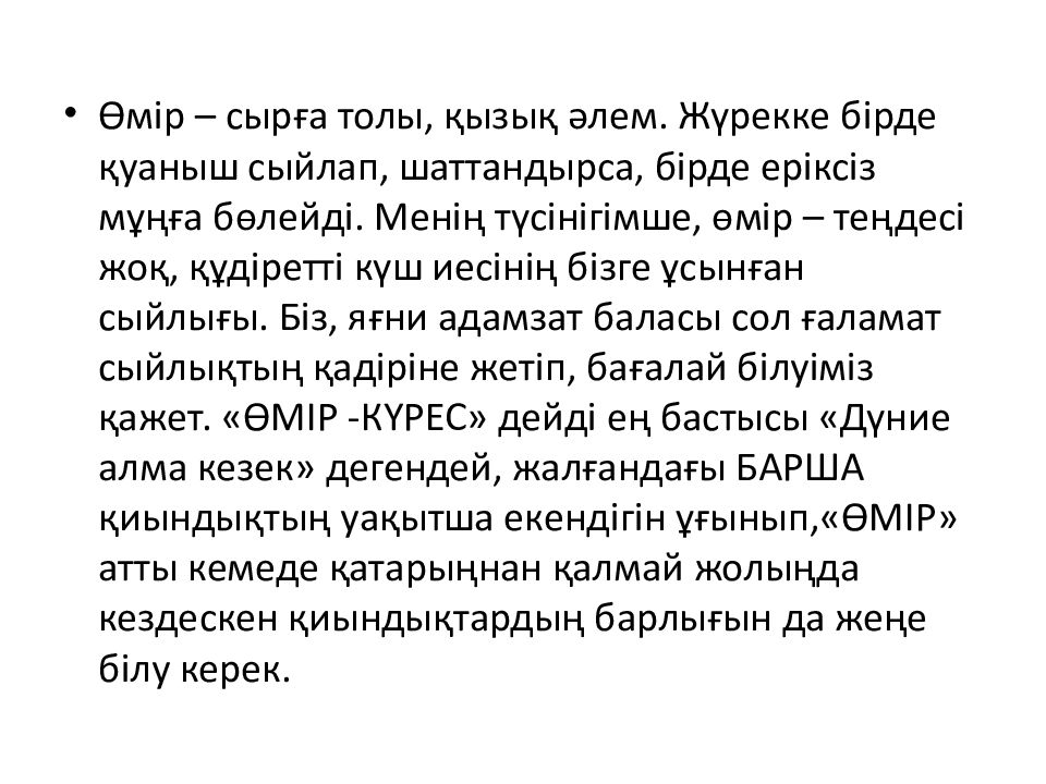Өмір – сырға толы, қызық әлем. Жүрекке бірде қуаныш сыйлап, шаттандырса, бірде еріксіз мұңға бөлейді. Менің түсінігімше, өмір – теңдесі жоқ, құдіретті күш иесінің бізге ұсынған сыйлығы. Біз, яғни адамзат баласы сол ғаламат сыйлықтың қадіріне жетіп, бағалай білуіміз қажет. «ӨМІР -КҮРЕС» дейді ең бастысы « Дүние алма кезек » дегендей, жалғандағы БАРША қиындықтың уақытша екендігін ұғынып,«ӨМІР» атты кемеде қатарыңнан қалмай жолыңда кездескен қиындықтардың барлығын да жеңе білу керек.