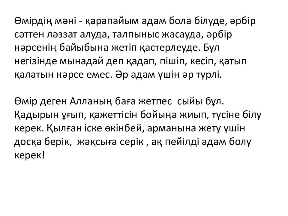 Өмірдің мәні - қарапайым адам бола білуде, әрбір сәттен ләззат алуда, талпыныс жасауда, әрбір нәрсенің байыбына жетіп қастерлеуде. Бұл негізінде мынадай деп қадап, пішіп, кесіп, қатып қалатын нәрсе емес. Әр адам үшін әр түрлі. Өмір деген Алланың баға жетпес сыйы бұл. Қадырын ұғып, қажеттісін бойыңа жиып, түсіне білу керек. Қылған іске өкінбей, арманына жету үшін досқа берік, жақсыға серік, ақ пейілді адам болу керек!