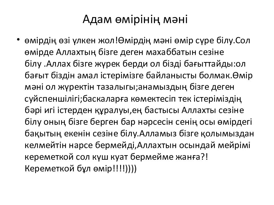 өмірдің өзі үлкен жол!Өмірдің мәні өмір сүре білу.Сол өмірде Аллахтың бізге деген махаббатын сезіне білу.Аллах бізге жүрек берди ол бізді бағыттайды : ол бағыт біздін амал істерімізге байланысты болмак.Өмір мәні ол жүректін тазалыгы;анамыздың бізге деген суйспеншілігі;баскаларға көмектесіп тек істеріміздің бәрі игі істерден құралуы, ең бастысы Аллахты сезіне білу оның бізге берген бар нәрсесін сенің осы өмірдегі бақытың екенін сезіне білу.Алламыз бізге қолымыздан келмейтін нарсе бермейді,Аллахтын осындай мейрімі кереметкой сол күш куат бермейме жанға ?! Кереметкой бұл өмір !!!!))))